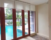 The fully furnished living room with large glass door to enjoy the pool and garden view.