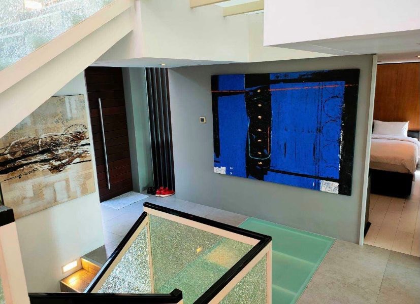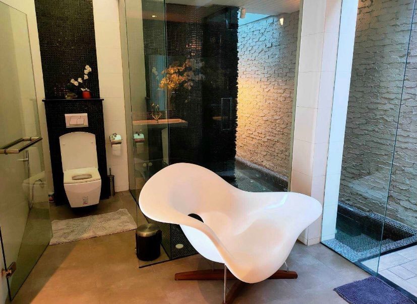 Designed in a modern, high-end style, the villa stands out from typical Phuket homes with custom-designed interiors, premium materials, and bespoke furnishings throughout. The open-plan living, dining, and fully equipped kitchen are located on the main level, along with a guest bedroom with ensuite bathroom, laundry room, and guest WC. A wrap-around balcony with outdoor jacuzzi connects the living area to the private swimming pool terrace.
