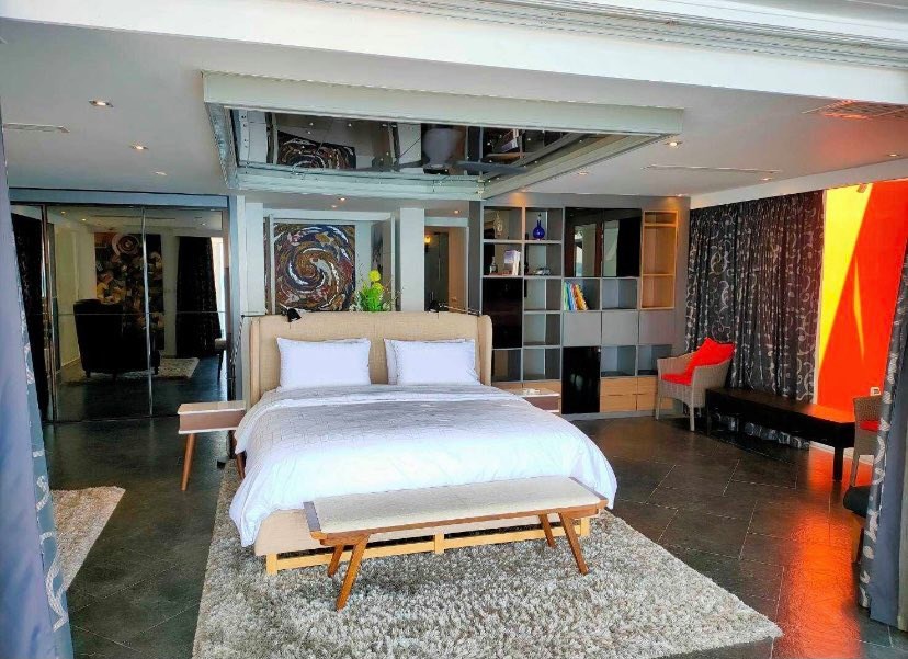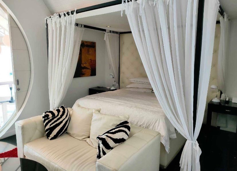 The upper level hosts a luxury master bedroom with king-size bed, large ensuite bathroom, walk-in wardrobe, and unique circular sliding doors opening to spectacular sea views. The lower level features a second master suite-style bedroom, large enough to function as a private apartment, complete with living area, office space, walk-in dressing room, and a spa-style bathroom with indoor jacuzzi. Floor-to-ceiling windows open directly to the pool and Kalim Beach access.