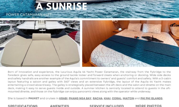 Power Catamaran Share Yacht Overview For more information please contact Fiona, Mobile / WhatsApp +66 92 695 8887 Line https://line.me/ti/p/ghTLMjf_tb Email fiona.phukettia@gmail.com www.phukettia.com #poolvilla #villaforrent #villaforsale #condoforrent #condoforsales #phuket #rawai #kamala #surin #bangtao #chalong #patong #Cherngtalay #propertiesforsale #propertyinvestment #propertiesforrent #yacht #catamaran #seatrip #cruise Details Property Status: For Rent Be the first to review “Power Catamaran” Cancel reply Rating Name Email Save my name, email, and website in this browser for the next time I comment. Review Related Properties For Rent ฿47,000 Yacht SPEED BOAT CATAMARAN 42 SPEED BOAT CATAMARAN 42 2 years ago For Rent Yacht Motor Boat Motor Boat 2 years ago Close